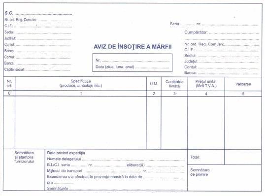 Aviz de insotire a marfii A5 3ex , 50set/carnet, hartie alb/color/color, coperta carton. Carnetele sunt capsate pentru o siguranta sporita,acestea fiind prevazute cu perfor la cotor pentru o rupere mai usoara. Hartia este de o calitate superioara. Tabelurile sunt construite pe baza legislatiei conform cerintelor.