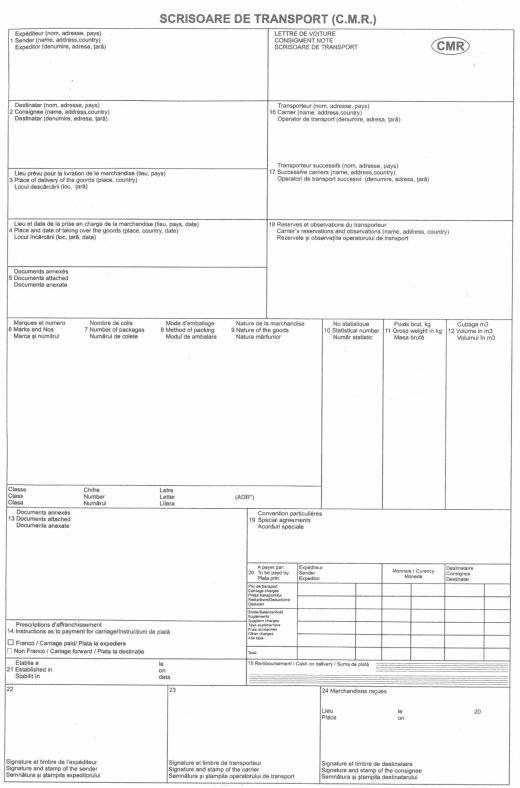 CMR 3 exemplare, 50 seturi x 3 exemplare, coperta carton, perfor nepersonalizate pe hartie autocopiativa, finisate pe format A4.